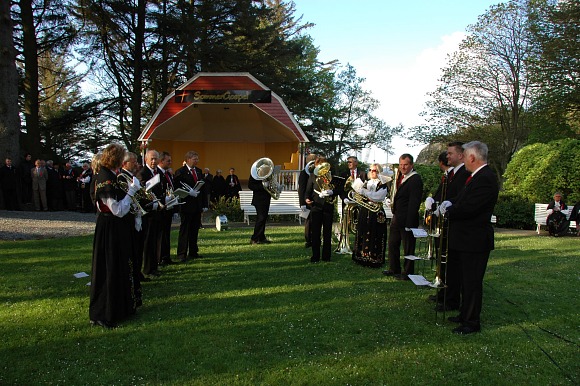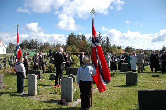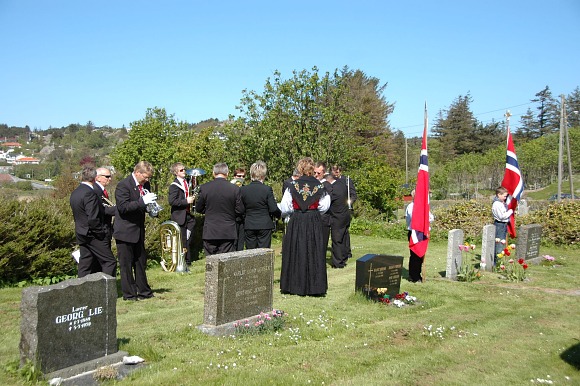 Uten at vi vet det på dette tidspunkt, så er dette siste gangen vi spiller ved kransenedleggelsen ved de engelske gravene ved Falnes Kirke. Speiderene står med flaggene og dette var en flott sermoni som fom 2009 er flyttet til en annen dag.